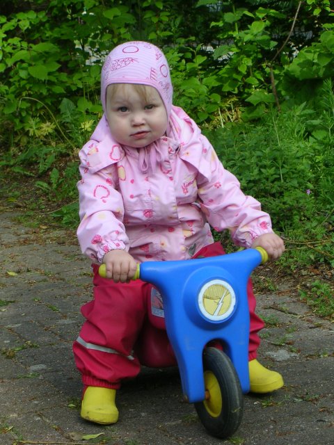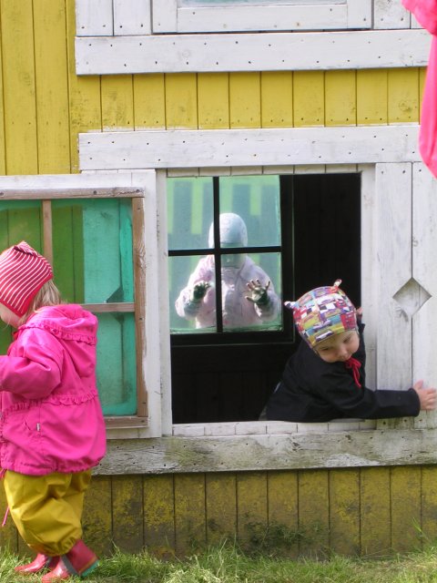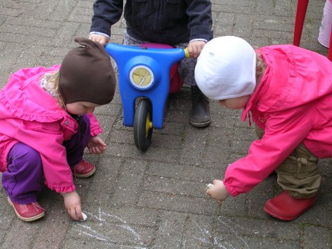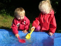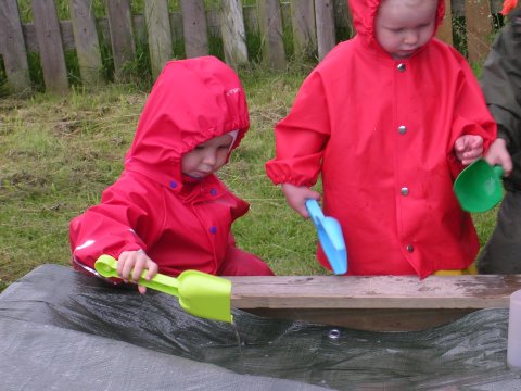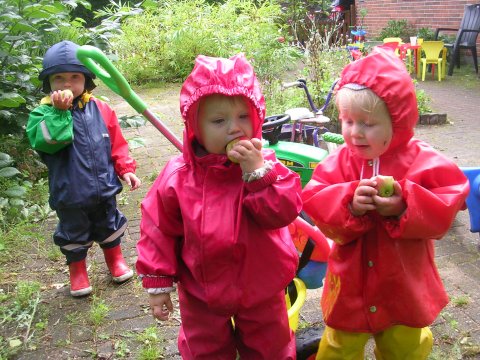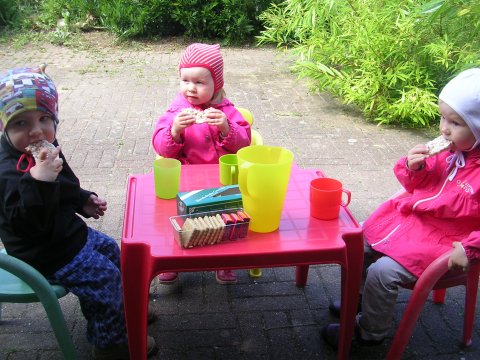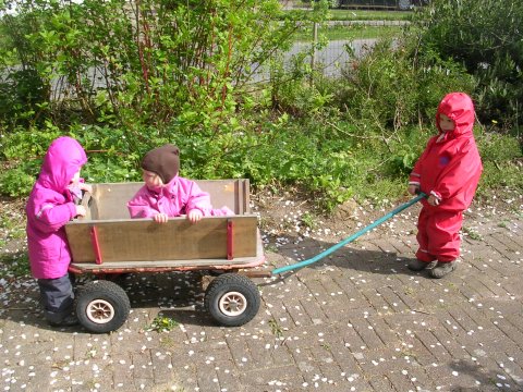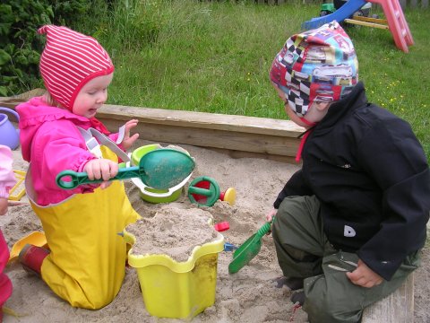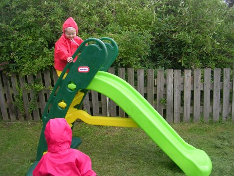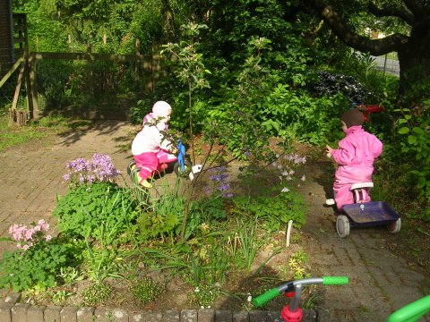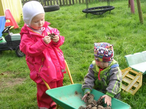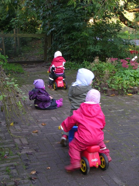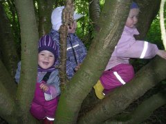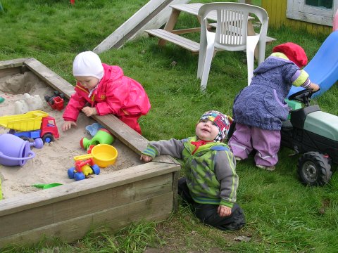 Vi har indrettet en indhegnet legeplads på 150 m2 til pasningsordningen, men jeg bruger hele haven, så børnene kan blive udfordret motorisk ved at klatre i træer, krybe under buske og kravle på bakker.