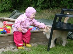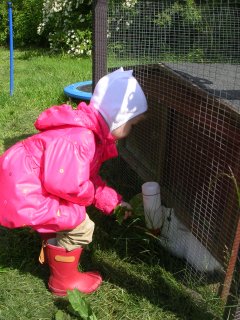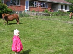 Vi har udekatte, heste, høns, kaniner og masser af frøer og græshopper.